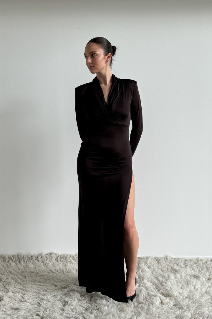 Midnight dress long fra Envelope1976. Midnight-kjolen er en nydelig maxikjole i en rik brun farge. Den har en oval åpning foran med elegant drapering, og kjolen har skulderputer og lange, smale ermer som gir en sofistikert silhuett. Den markerte midjen fremhever figuren din, noe som gjør den til et perfekt valg for bryllupsgjester, fester eller gallaer.