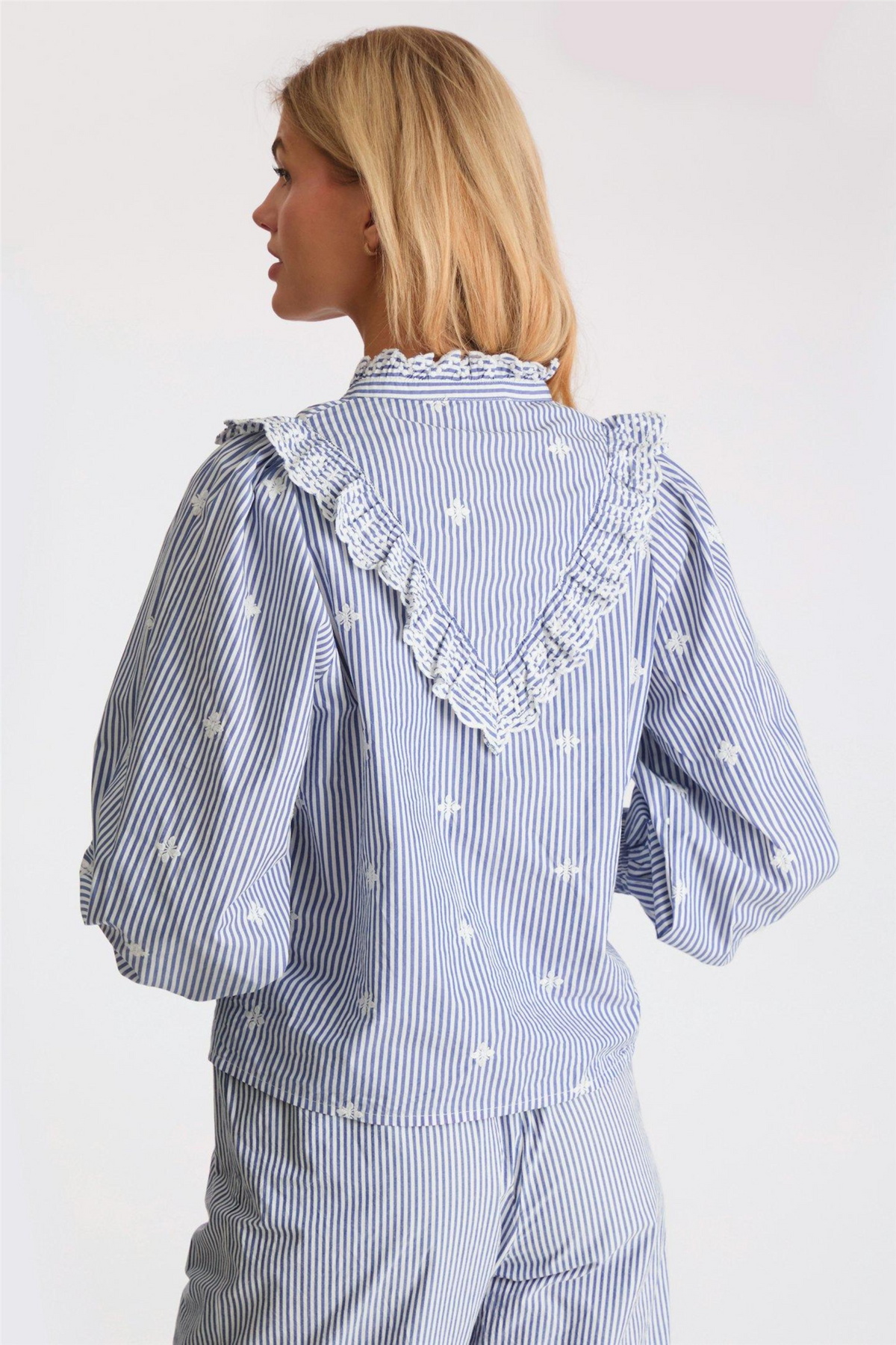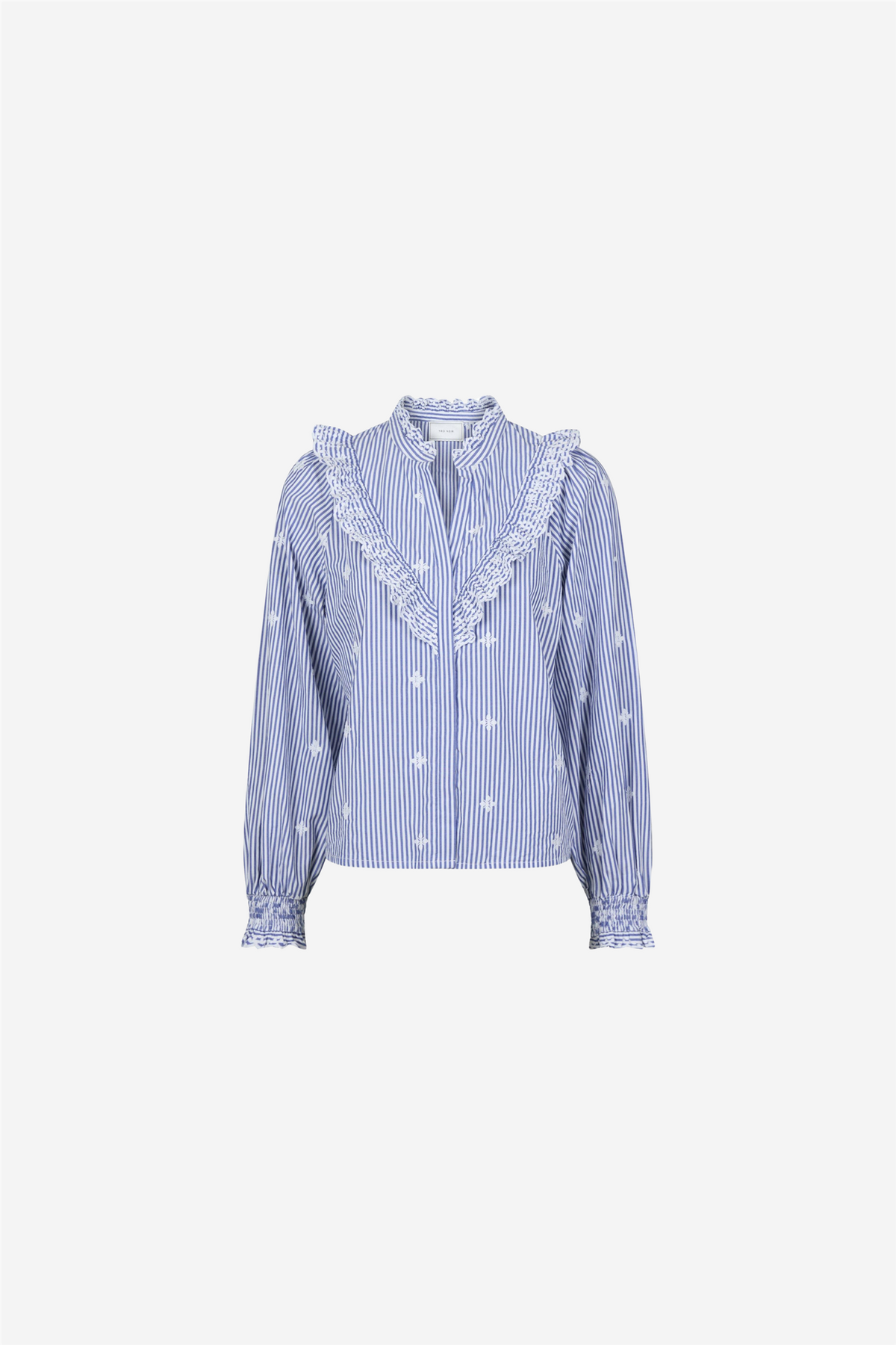 Degas Stripe Blouse fra Neo Noir. Pen skjorte med volangdetaljer på halsen, brystet og ermene.