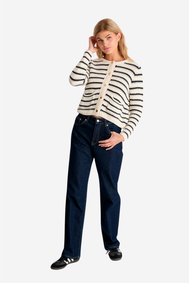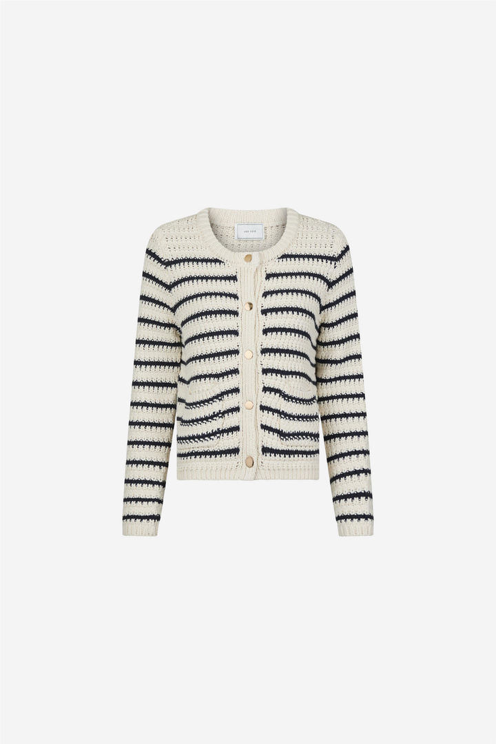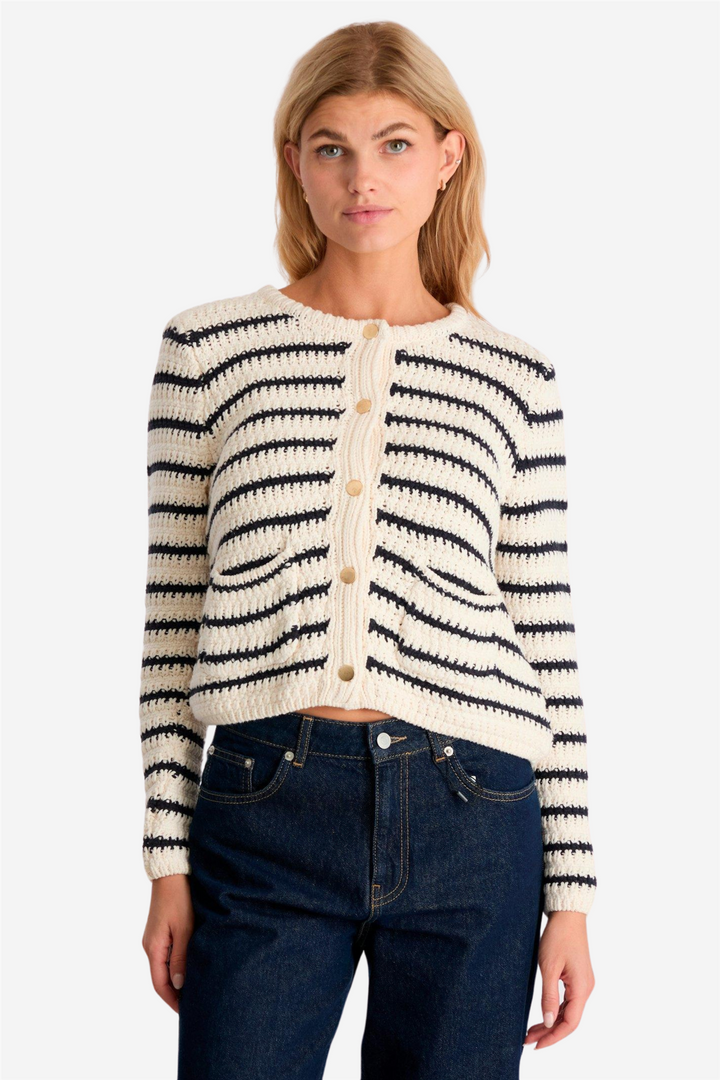 Paula Knit Cardigan fra Neo Noir. Flott strikket cardigan i 100% bomull. Cardiganen har to frontlommer som lukkes med knapp.