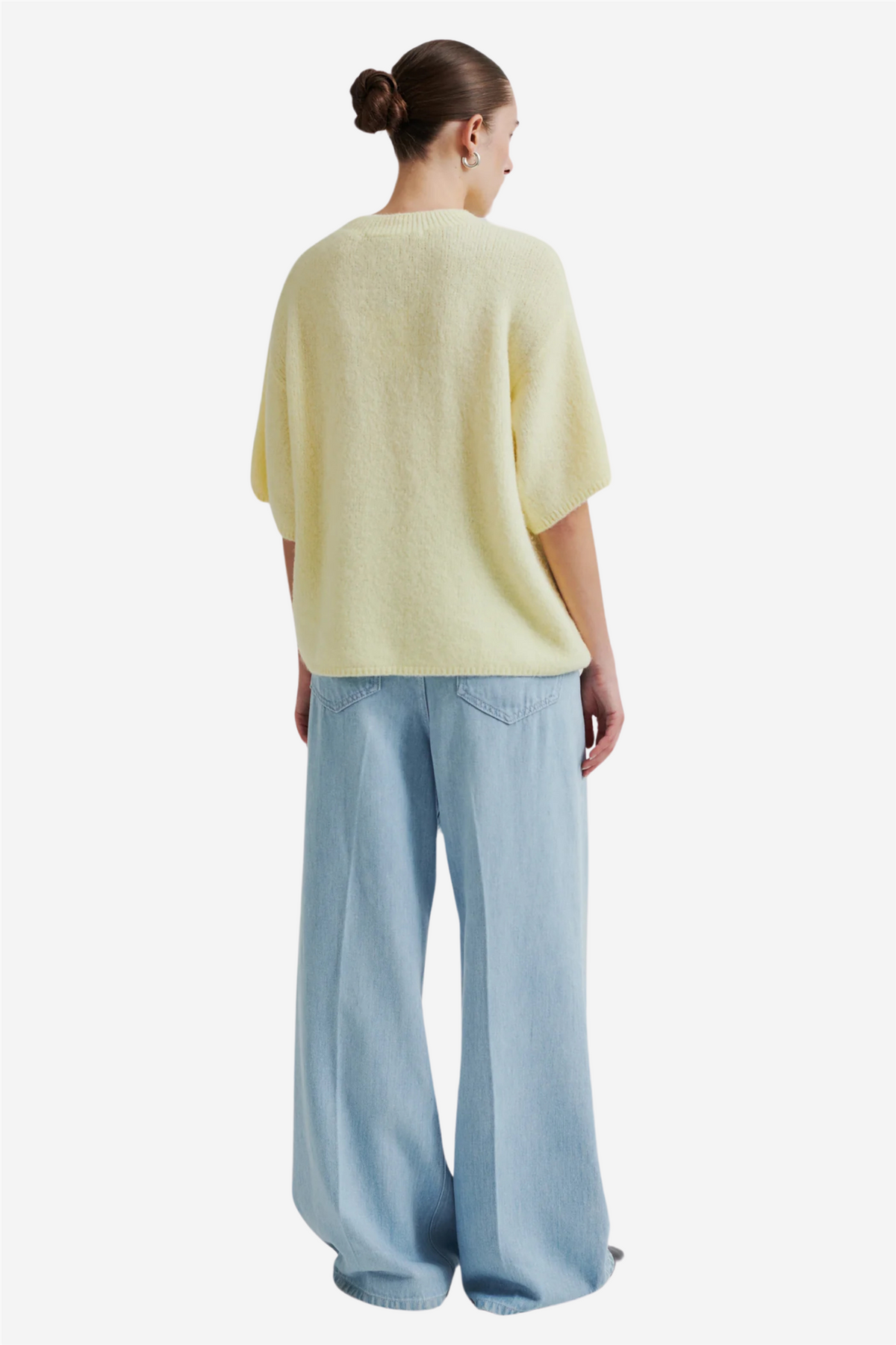 Wanda Knit O-Neck fra Second Female. Genseren er laget av en myk og elastisk alpakka-blanding. Den har ribbestrikkede kanter ved halsen, ermeendene og nederkanten. Vid og avslappet passform.