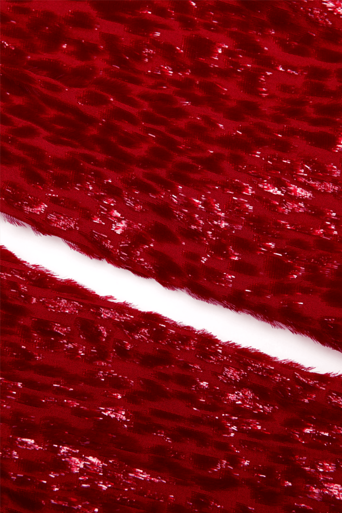 Red Fil Coupe Maxi Dress fra Self-Portrait er en elegant og dristig kjole designet for å skape et varig inntrykk. Laget i glitrende fil coupé-stoff som fanger lyset på en sofistikert måte. Kjolen har en figurnær passform med nøkkelhullsdetalj i front og en dyp, åpen rygg som fremhever den feminine silhuetten. Draperingene gir en flatterende effekt og tilfører en sensuell eleganse til uttrykket. Perfekt til formelle anledninger, galla eller kvelder hvor du ønsker å skinne.