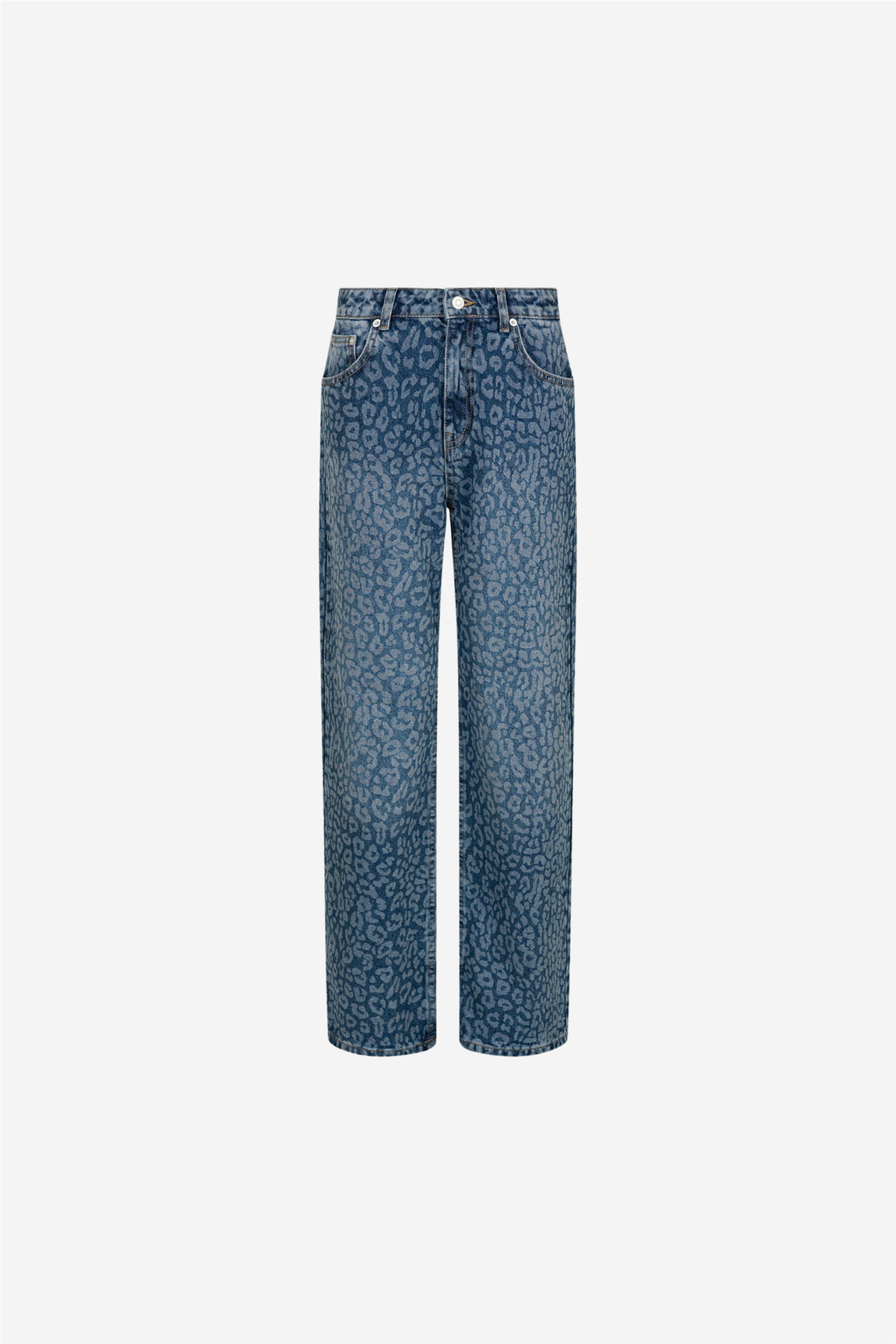 Simona Fade Leo Pants fra Neo Noir er en mid-waist denim bukse med glidelås og knappelukking foran. Buksene har vide ben og er designet med et ton-i-ton vasket leopardmønster.