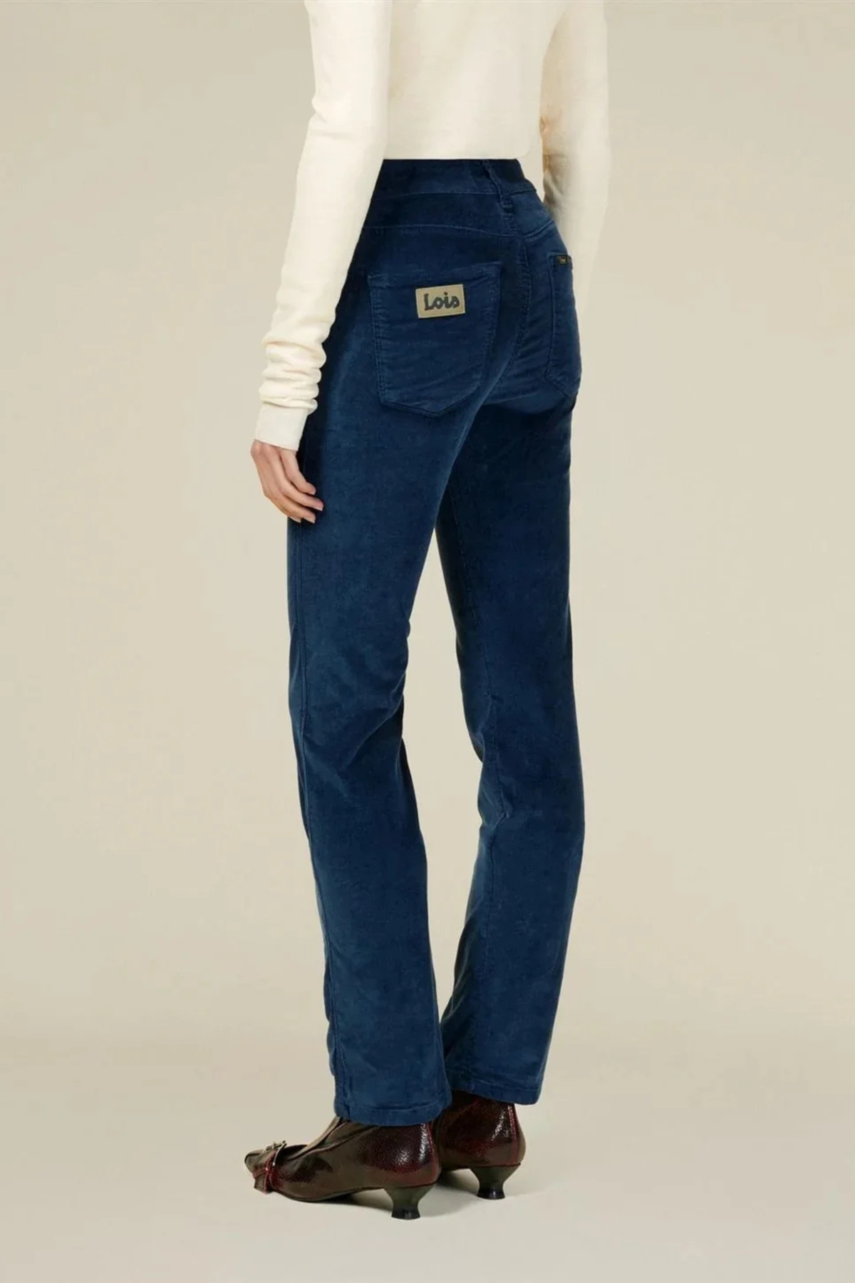 Malena Micro Cord fra Lois er en myk og flatterende bukse i mørkeblå kordfløyel. Den har medium til høyt liv, smale og rette ben, og et klassisk uttrykk med fem lommer, knapp og glidelås i front. Den ankelkorte lengden gjør den perfekt både til sneakers og boots. Den myke kvaliteten med stretch gir en behagelig passform og god bevegelsesfrihet. Normal i størrelsen.