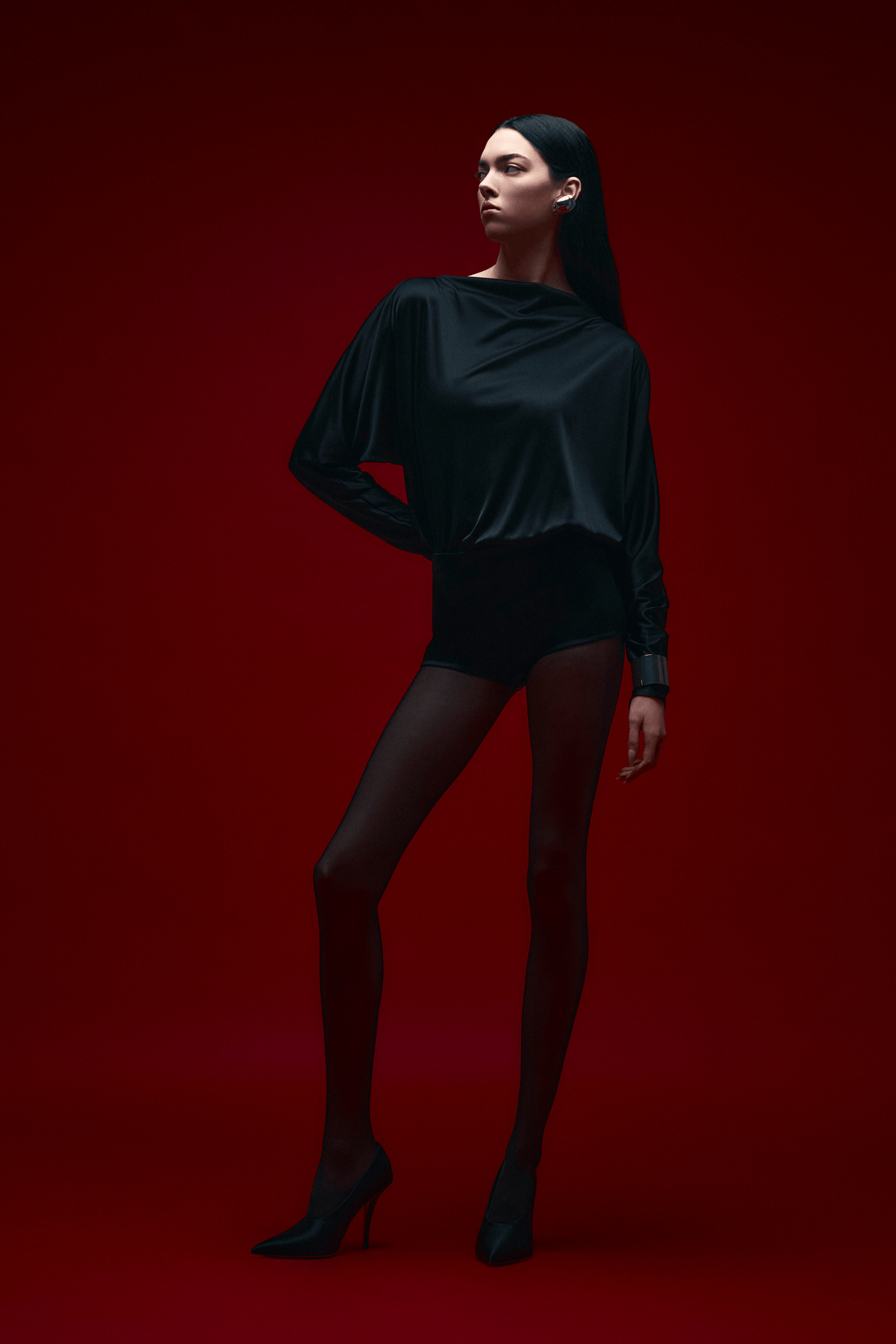 Winnie Open-Back Playsuit fra The Andamane er laget av et skinnende jerseystoff i svart. Modellen har myke, buede linjer med en båthals som går over i lange ermer. I kontrast til fronten har playsuiten en åpen rygg, rammet inn av et enkelt bånd i nakken.