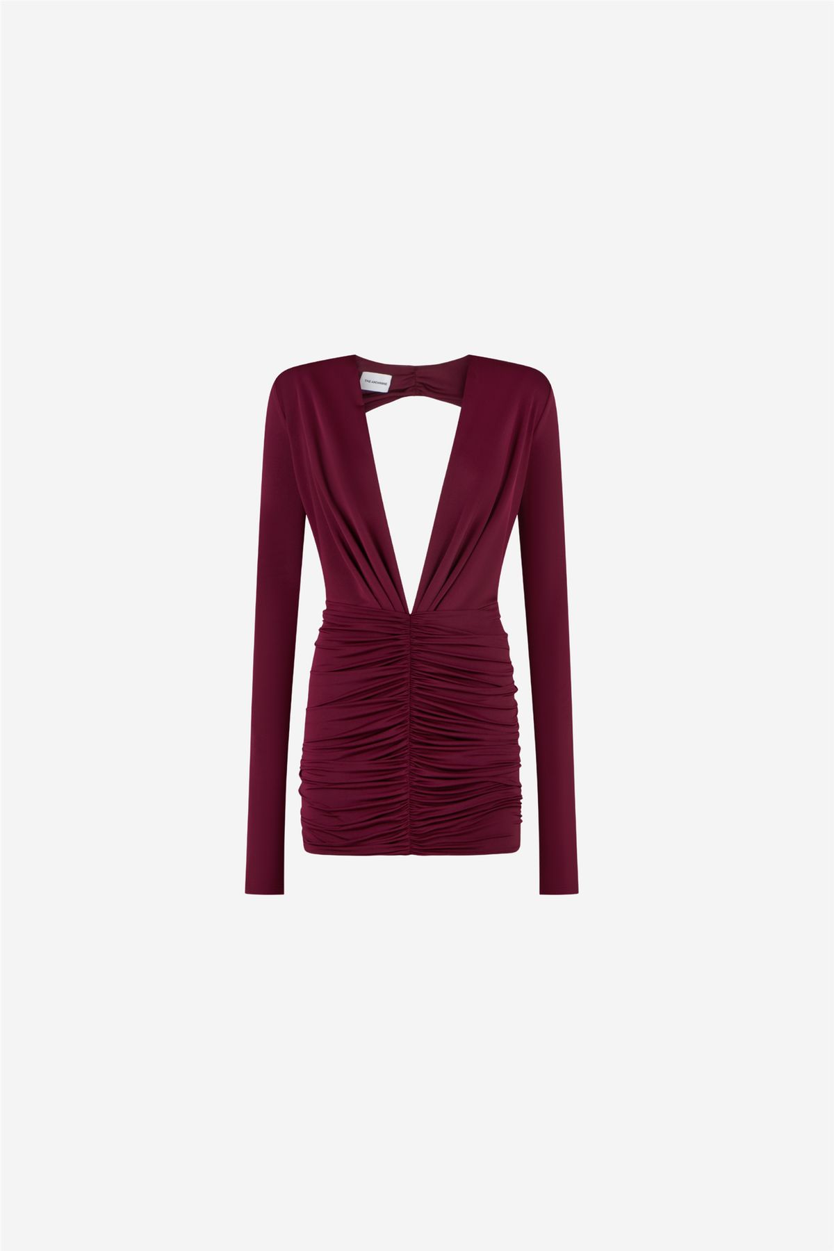 Zelda Mini Dress fra The Andamane er laget av et lett jerseystoff i fargen Cabernet. Kjolen har en dyp V-utringning foran og åpen rygg, med lange ermer som rammer inn silhuetten. Skjørtet er dekorert med rynkedetaljer over hele, som gir tekstur og dybde til designet.