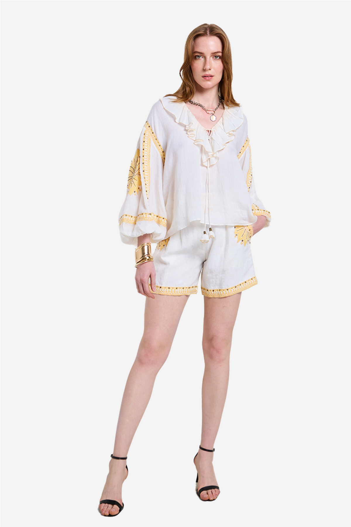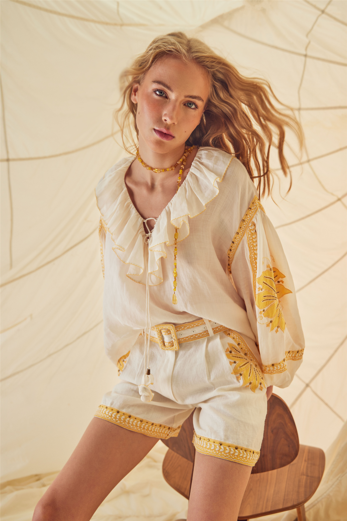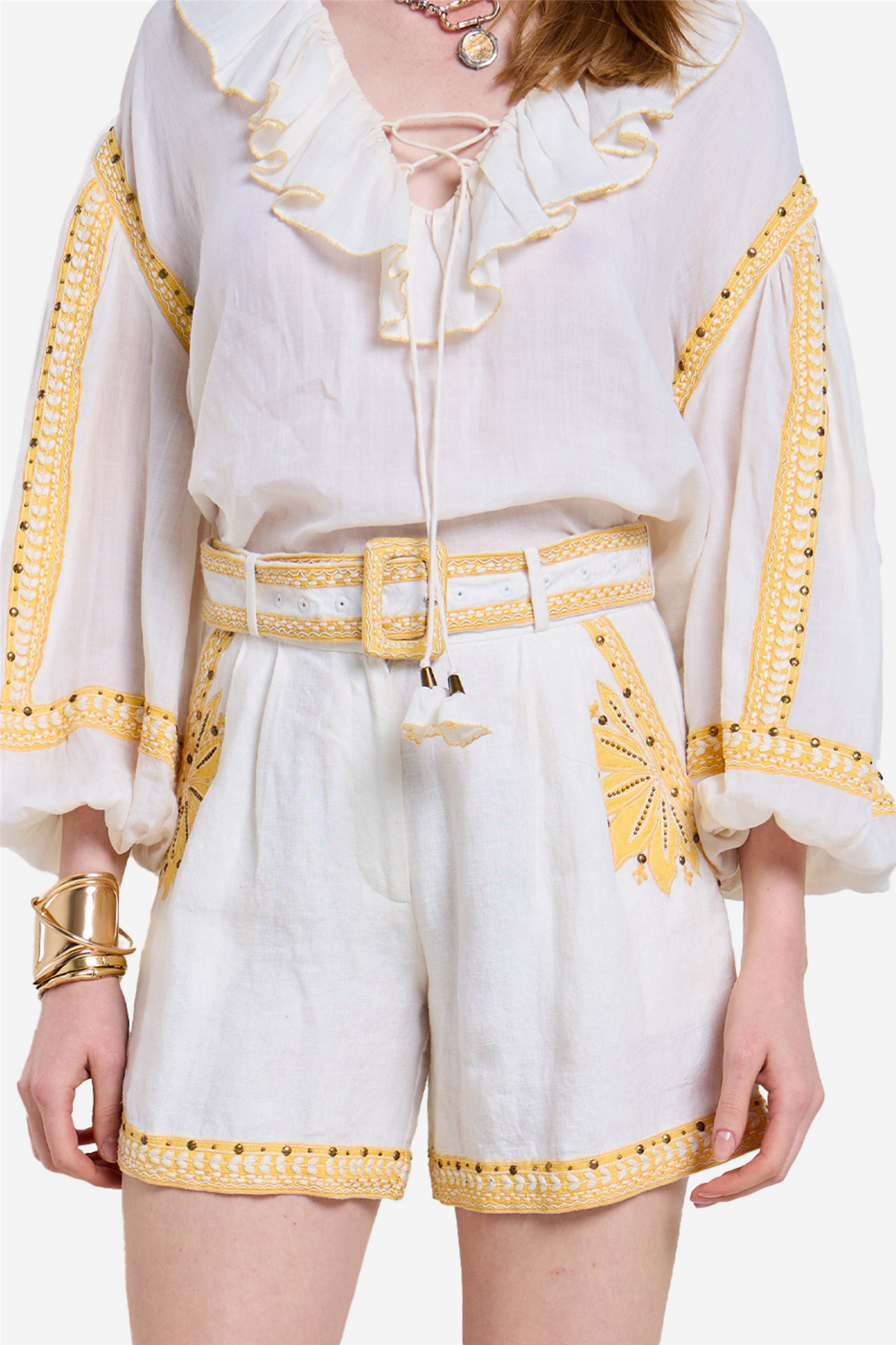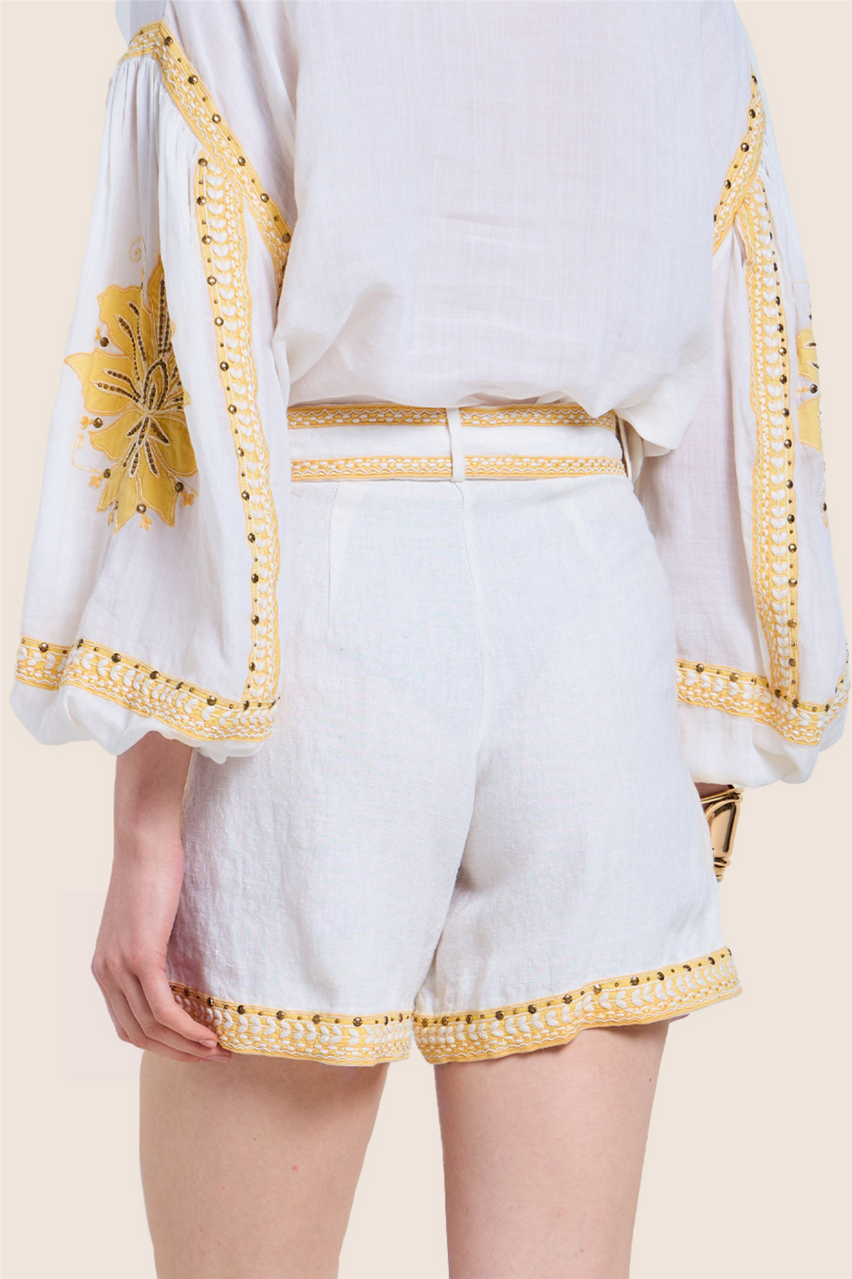 Love The Moment Shorts fra Scarlett Poppies. Strål med tidløs eleganse i Love the Moments-shortsen. Laget av kraftig lin, har denne shortsen et stivt, avtakbart belte med dekorkant i blonde og innvendig buckram-forsterkning – som gir et chic og strukturert uttrykk. Kontrastfarget applikasjonsbroderi, dekorert med antikkmessingpaljetter og håndsydde perledetaljer, rammer inn sidelommer og falder for et sofistikert preg.