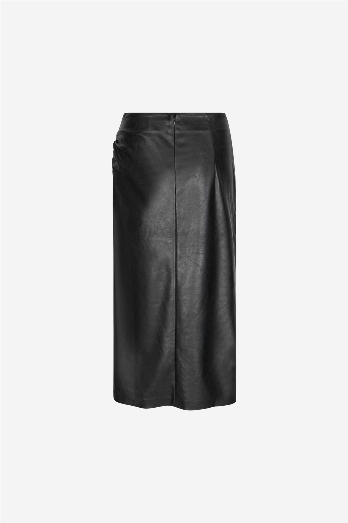 Seema Skirt fra Second Female. Skjørtet er laget i imitert glatt PU-skinn med litt stretchy kvalitet. Det har en skjult glidelås, hektefeste bak i midjen, samlede sømmer på den ene siden og dyp splitt på den ene siden. De tilpassede sømmene skaper en feminin og delikat siluett rundt midjen og hoftene.