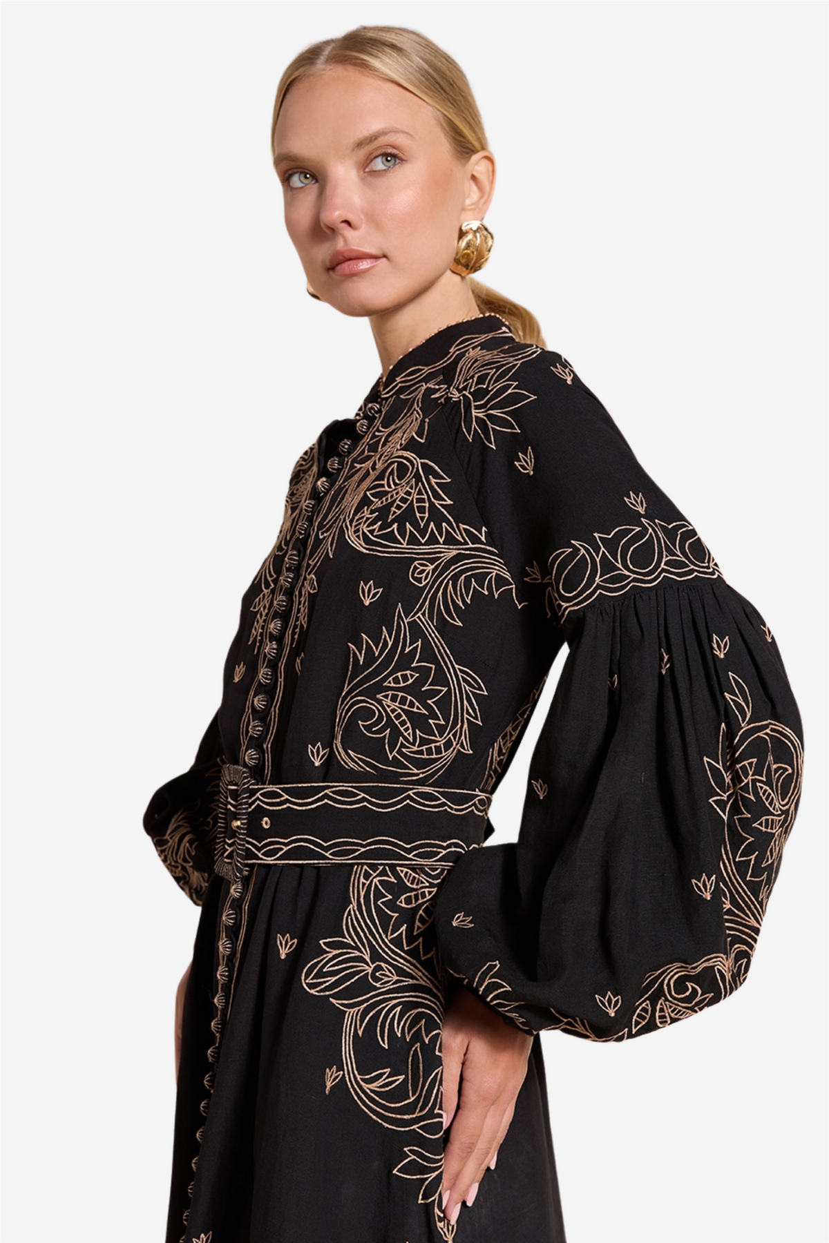 Beyonce Long Dress fra Scarlett Poppies har vakre broderte detaljer laget av deres elskede lin-viskoseblanding.