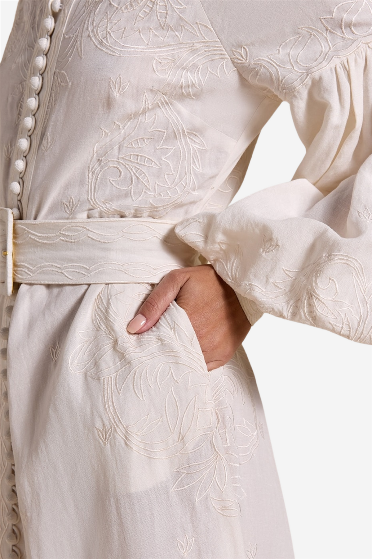 Beyonce Long Dress fra Scarlett Poppies har vakre broderte detaljer laget av deres elskede lin-viskoseblanding.