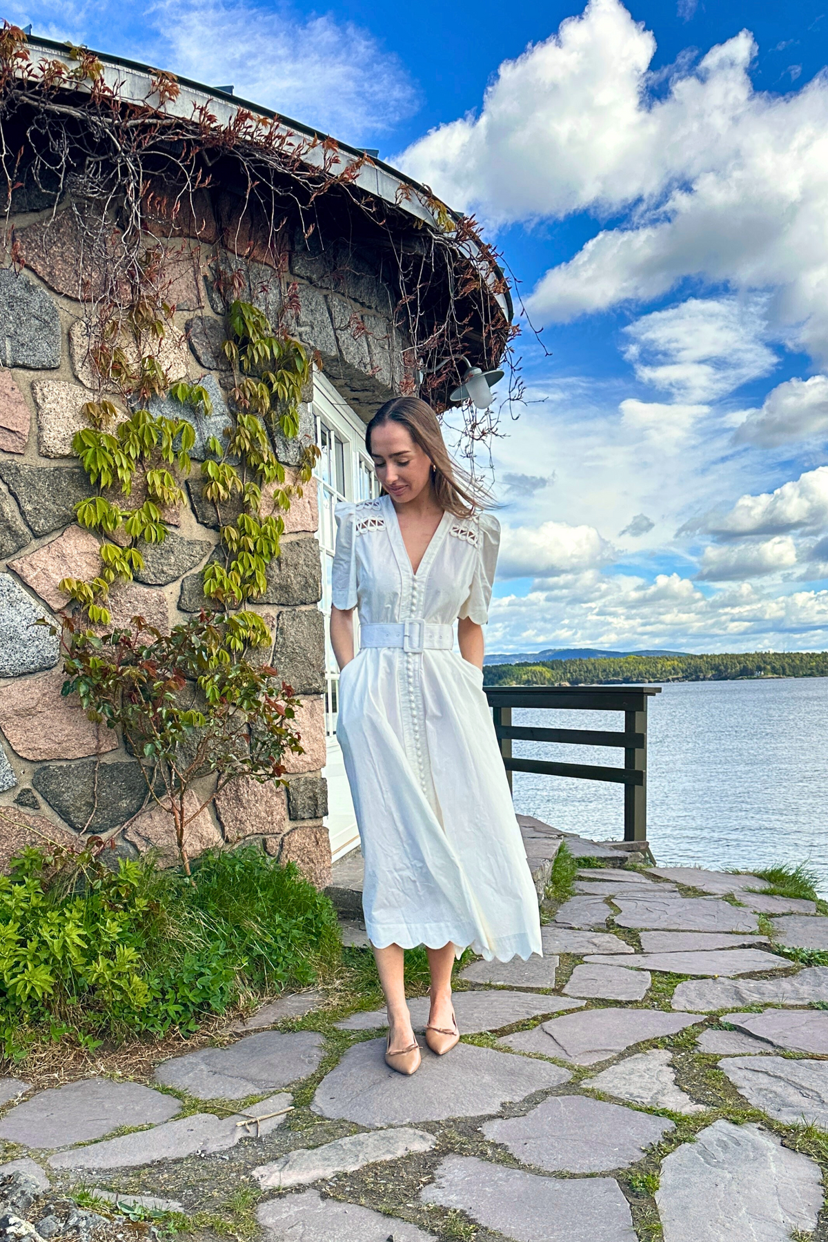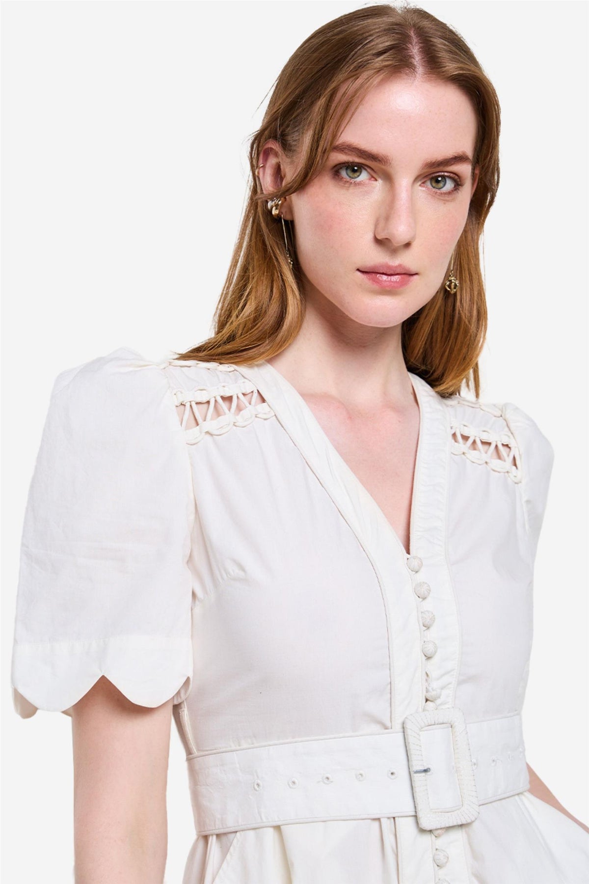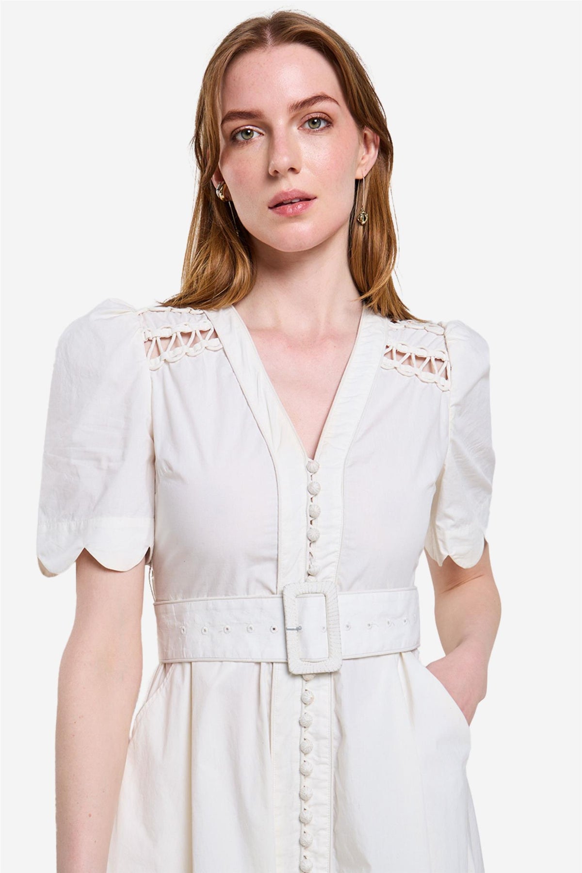 Euphoria Long Dress fra Scarlett Poppies er laget av frisk bomullspoplin, har scalloped hem og sidelommer som kombinerer stil og funksjonalitet. Broderte stoffdome-knapper gir et unikt preg, mens det avtagbare beltet øker allsidigheten. Intrikate stofforigami med sammenflettede stoffrouleau viser Scarlett Poppies' dyktige håndverk og sans for detaljer, og gir en sofistikert finish. Perfekt for et raffinert og stilfullt utseende.