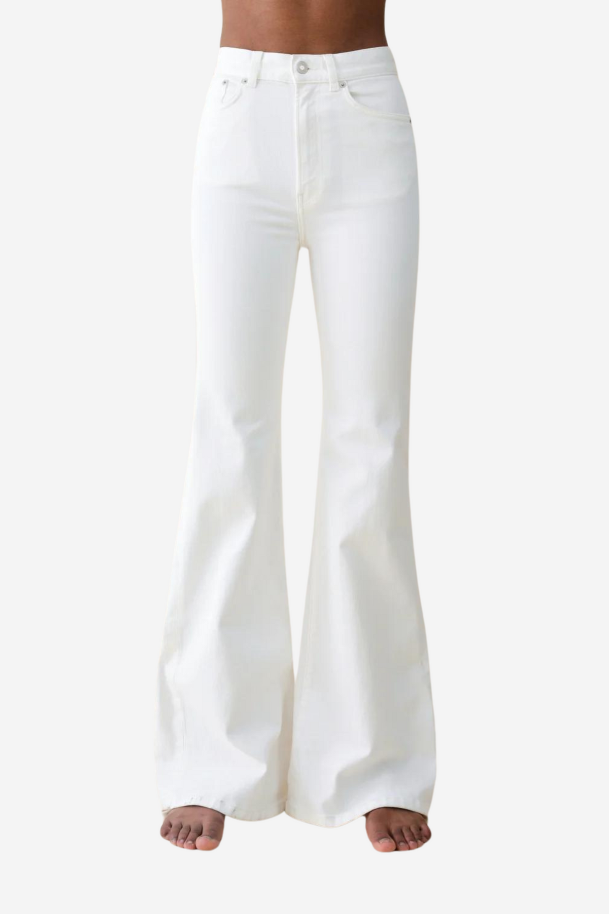 En frisk tolkning av den skyhøye 1970-tallssilhuetten! Fuji Jeans fra Jeanerica kommer med glidelås- og knappelukking, høy midje og dramatisk sleng. Den er laget i ufarget kremhvit organisk denim. Jeansen har også Jeanericas signaturstretch som gjør den komfortabel og fleksibel. En ny, fresh modell som er like fin til hverdag som til fest. Fuji gjør hverdagsantrekket spennende!